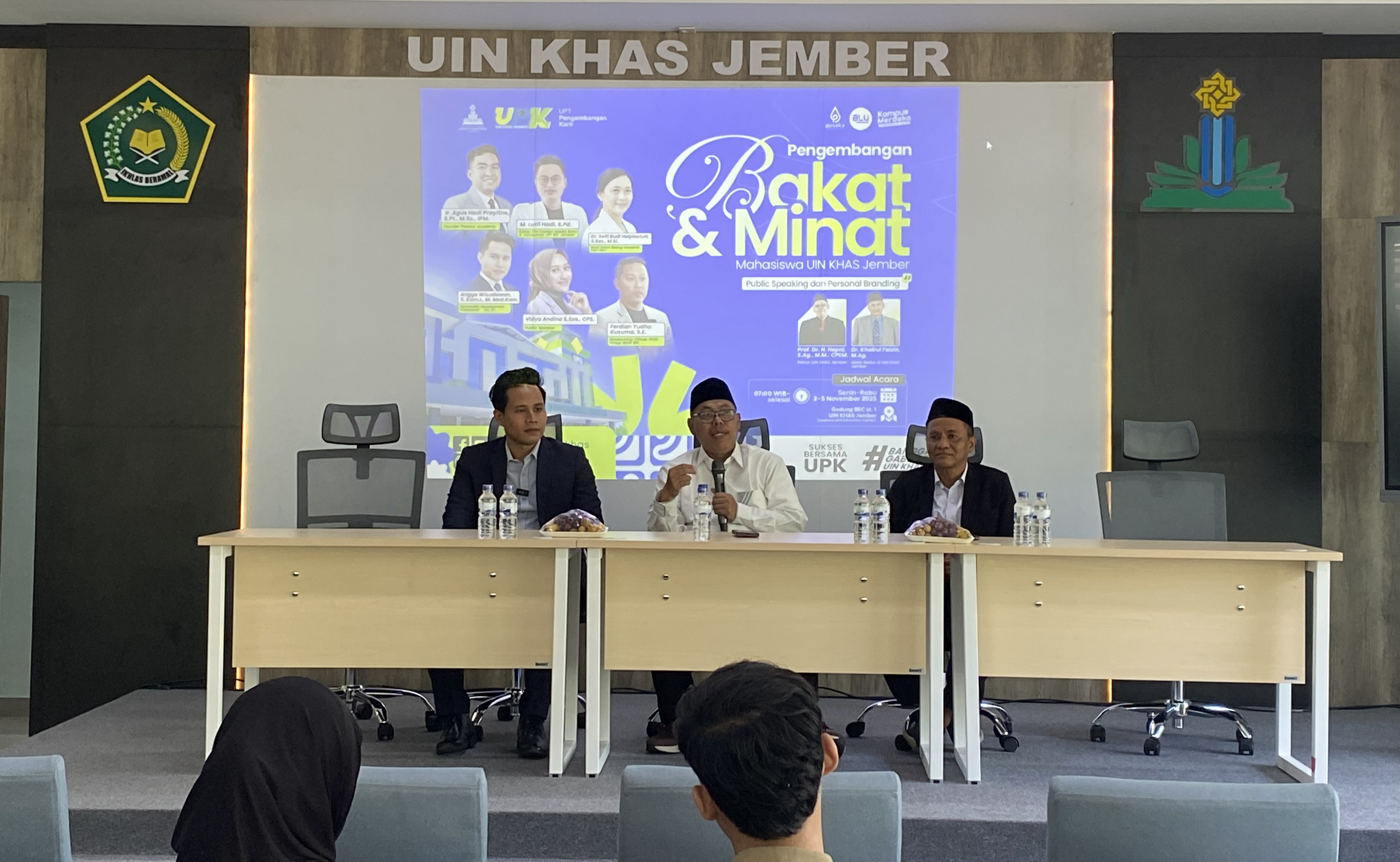 UPT Pengembangan Karir (UPK) Universitas Islam Negeri Kiai Haji Achmad Siddiq (UIN KHAS) Jember menyelenggarakan kegiatan Pengembangan Bakat dan Minat Mahasiswa UIN KHAS Jember bertajuk “Public Speaking & Personal Branding”. Kegiatan ini dilaksanakan pada hari Senin s/d Rabu tanggal 03, 04, 05 November 2025 di Aula Internasional Gedung BEC UIN KHAS Jember yang diikuti oleh mahasiswa dari berbagai fakultas dan menjadi salah satu program strategis UPK dalam mendukung peningkatan kompetensi non-akademik mahasiswa. Kegiatan ini pastinya menghadirkan sejumlah narasumber dari kalangan akademisi profesional.